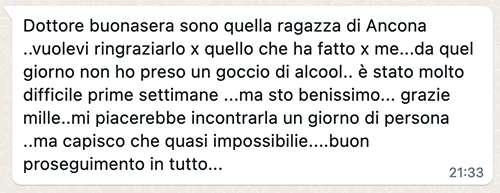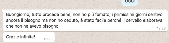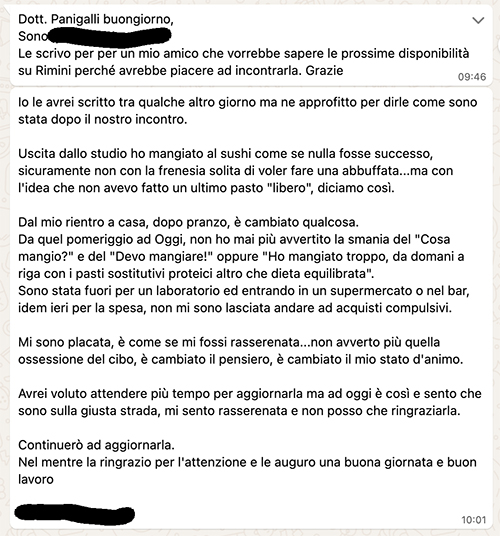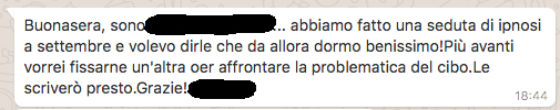 In questa pagina mostro alcuni messaggi ricevuti dai pazienti qualche tempo dopo le sedute. Questi messaggi servono solo a dare l'idea di come si manifestino i cambiamenti dopo la terapia ipnotica. È importante sapere che non sempre si ottiene il risultato sperato.
