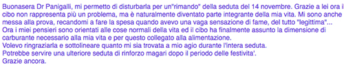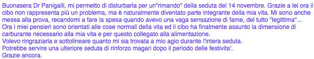 È importante considerare questi messaggi un esempio di come si manifesta il cambiamento nel rapporto con il cibo dopo una seduta di ipnosi per dimagrire. L'obiettivo è ritrovare l'equilibrio e la perdita di peso è una conseguenza naturale di questo risultato. Lo scopo non è perdere peso rapidamente a costo di grandi privazioni, ma ritrovare il controllo. Il tutto è chiaramente compatibile con il lavoro di specialisti che aiutano dal punto di vista alimentare. L'ipnosi non sostituisce l'intervento del medico o del nutrizionista, ma lo integra e cerca di favorirlo.