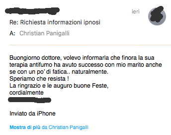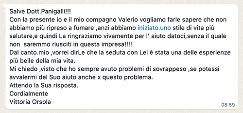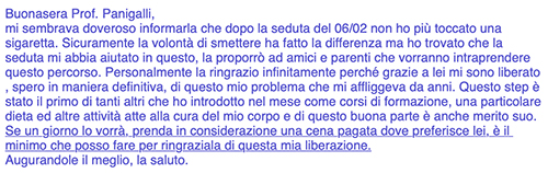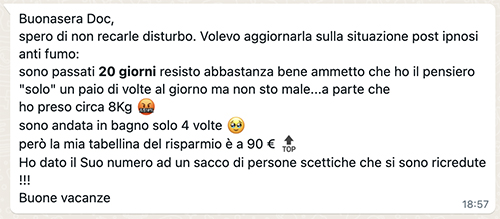 È importante considerare questi messaggi un esempio di risultati positividopo una seduta di ipnosi per smettere di fumare. Non sempre purtroppo il risultato viene raggiunto e sono tante le variabili in gioco. Le capacità del terapeuta prima di tutto, ma anche la motivazione e la volontà non sempre al 100%.